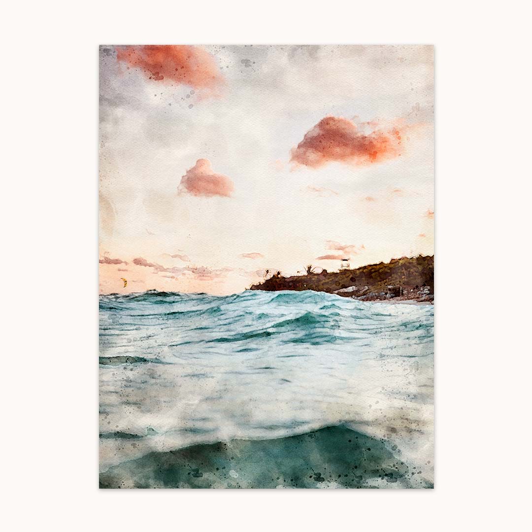 Wunderschöne Meer-Atmosphäre mit einer Palme in Aquarell gemalt. Perfekt für jedes Sommer-Feeling für Dein Zuhause. Kombiniere das Motiv perfekt mit anderen Bilder aus der Meer-Kollektion.