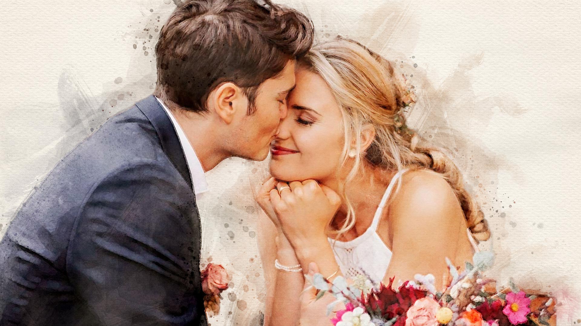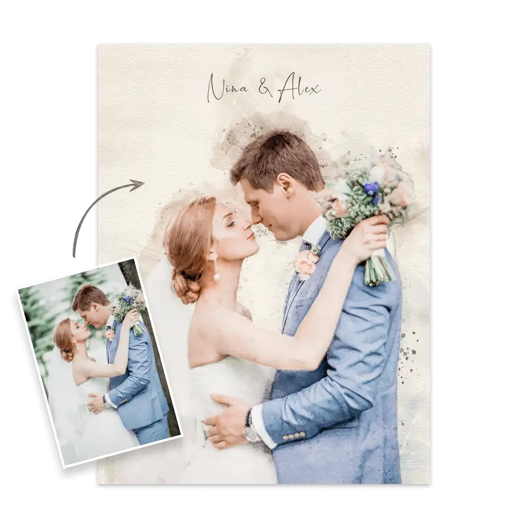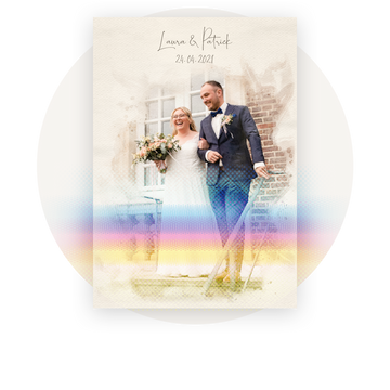 Your personalized wedding painting is made according to your photo template and is a unique memory for your home or the perfect gift idea. Your most beautiful moment immortalized as an individual portrait for eternity on a poster or canvas.